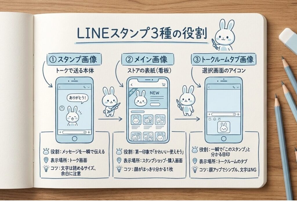 LINE登録に必要な3種類の画像(スタンプ画像/メイン画像/トークルームタブ画像)を意識するのが大事です。