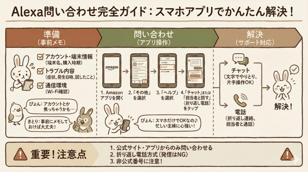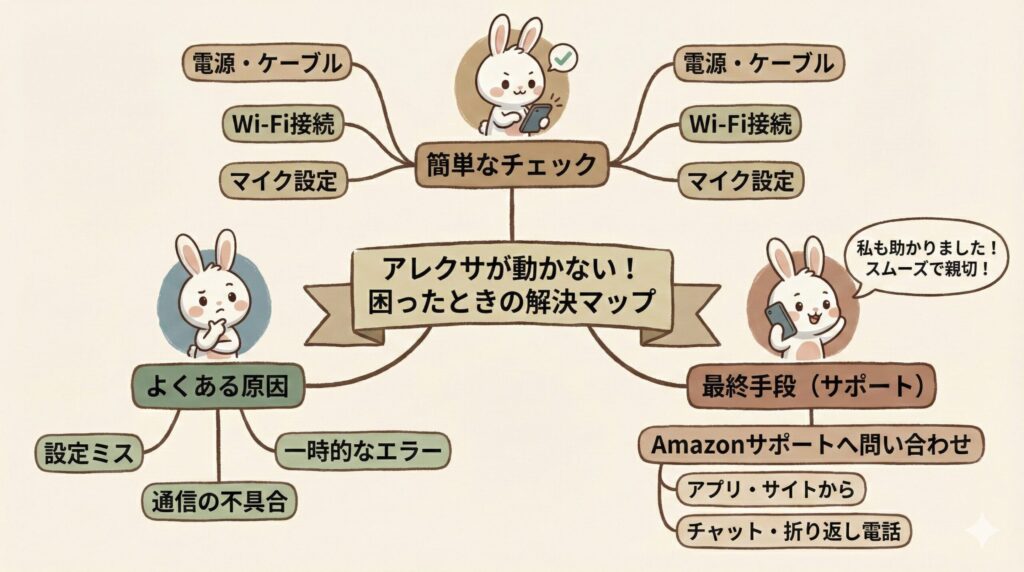 この記事では、私の体験も交えながら、アレクサで困ったときの簡単なトラブル解消法と、Amazonへの問い合わせ方法(アプリ/サイト/チャット・折り返し通話)を、主婦・初心者の方にもわかりやすく解説します。