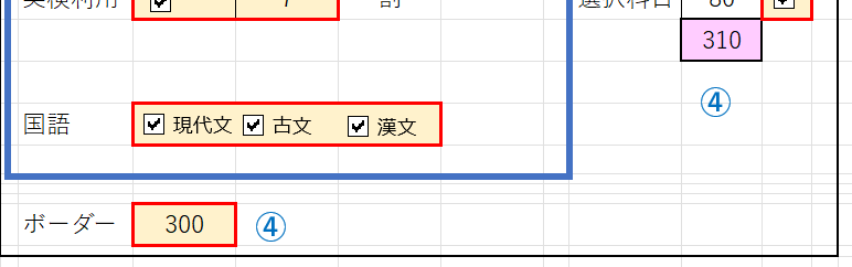 なお、このエクセルは、私の子どもが「3教科型」の共通テスト利用だったため、
