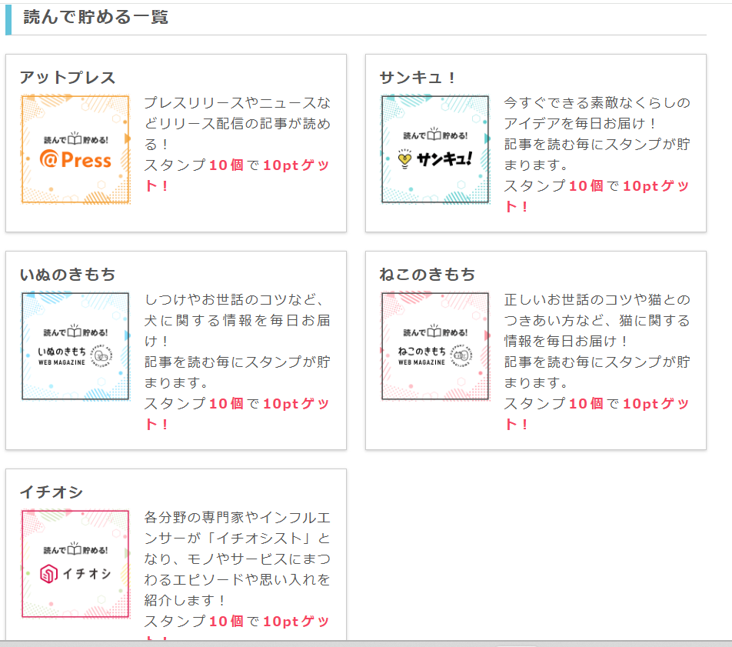 サンキュ!など、主婦向けメディアの記事を読んでポイントがもらえるコーナーです。