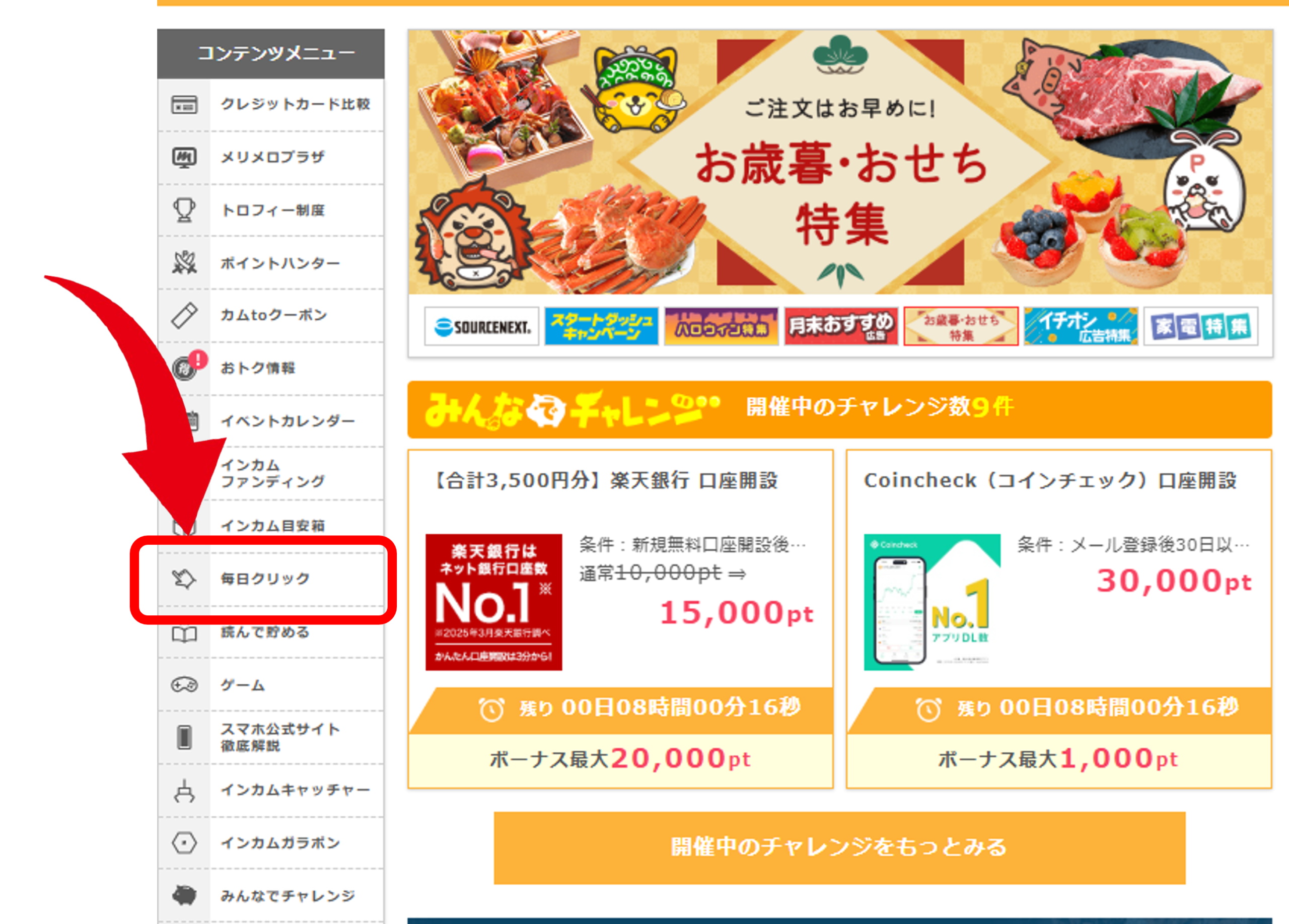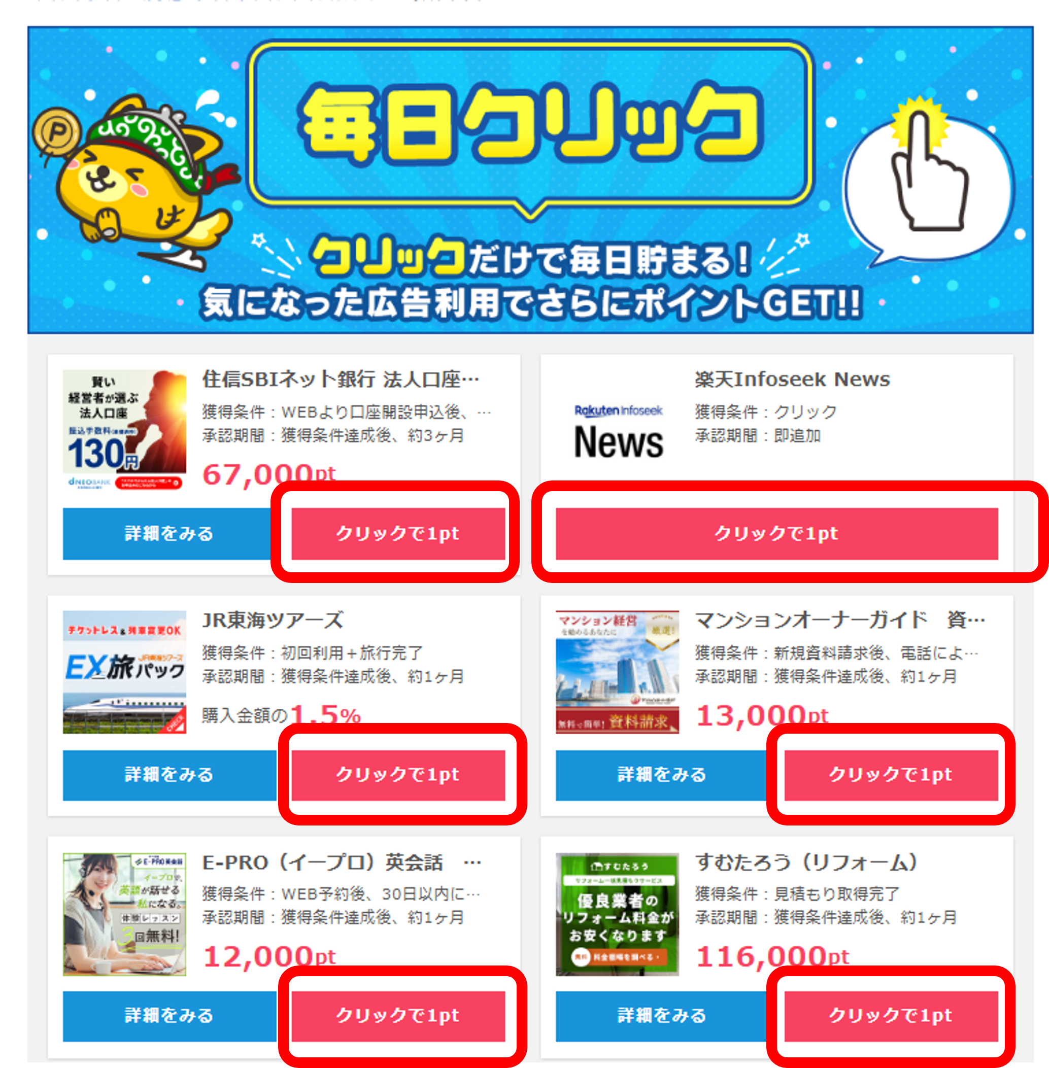 ポイントインカムのトップにある「毎日クリック!」のバナーをタップするだけで、