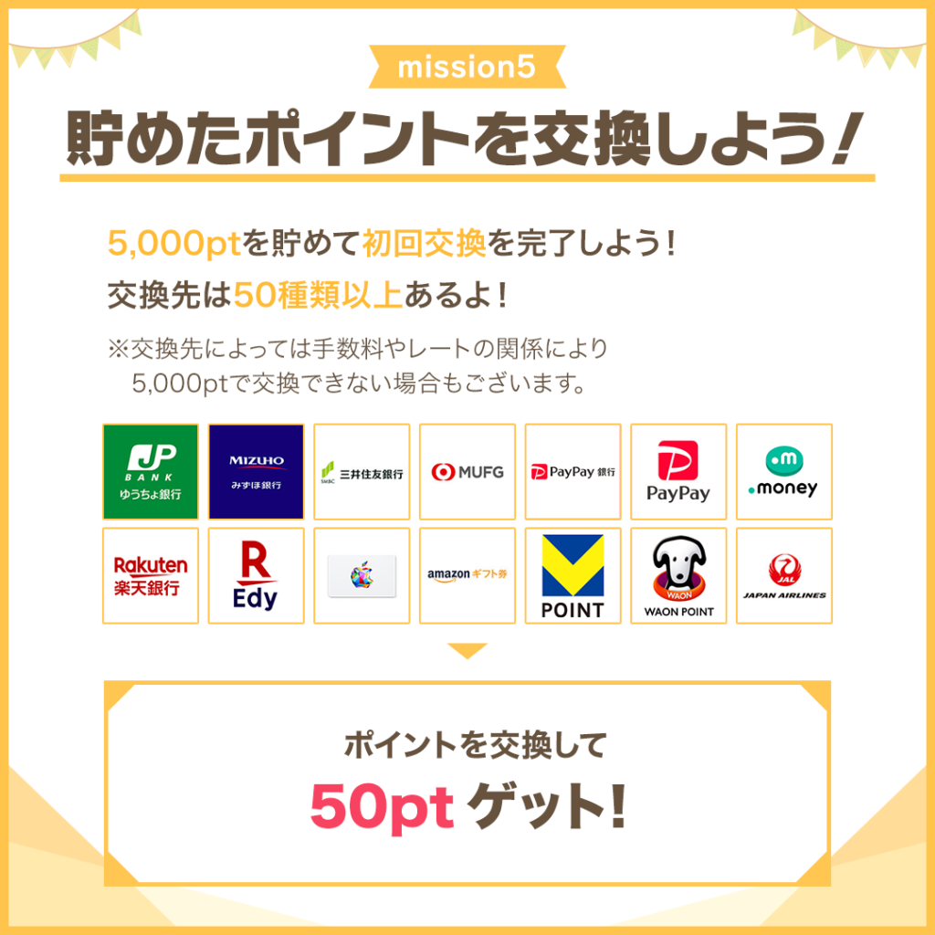 簡単なミッションをこなすだけで、初回から数百ポイントがもらえます。